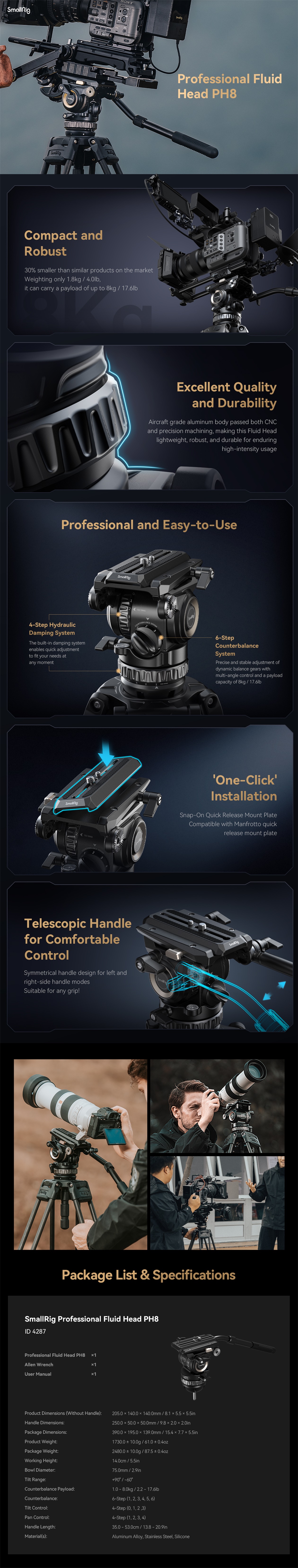 A SmallRig Professional Fluid Head PH8 4287 egy professzionális fluid fej a videózás megkönnyítésére. A fluid fej állítható 6 fokozatú ellensúlyozó rendszerrel rendelkezik. Amikor a gravitációs középpont magassága 55 mm / 2,2", a 6 lépéses ellensúlyozó rendszer kiegyensúlyozza a kamerát vagy más rigeket (legfeljebb 8 kg / 17,6 lb), és pontosan szabályozza a kamera dőlését. Az állítható 4 fokozatú hidraulikus csillapítórendszer lehetővé teszi a forgatás és a dőlés beállítását, és biztosítja a kamera sima pásztázását és dőlését. A PH8 folyadékfej egy új Touch-and-Go gyorskioldású rögzítőlemez kialakítást alkalmaz, amely nem igényel igazítást, és hatékonyabb, mint a hagyományos becsúsztatható lemezek. A felhasználóbarát, levehető teleszkópos fogantyú lehetővé teszi a jobb és bal oldalra történő forgatásos rögzítést, így bármilyen fogáshoz alkalmas. A Professional Fluid Head PH8 könnyű, kompakt és robusztus. Súlya mindössze 1,8 kg / 3,9 font, így kisebb, mint a piacon kapható hasonló termékeké.