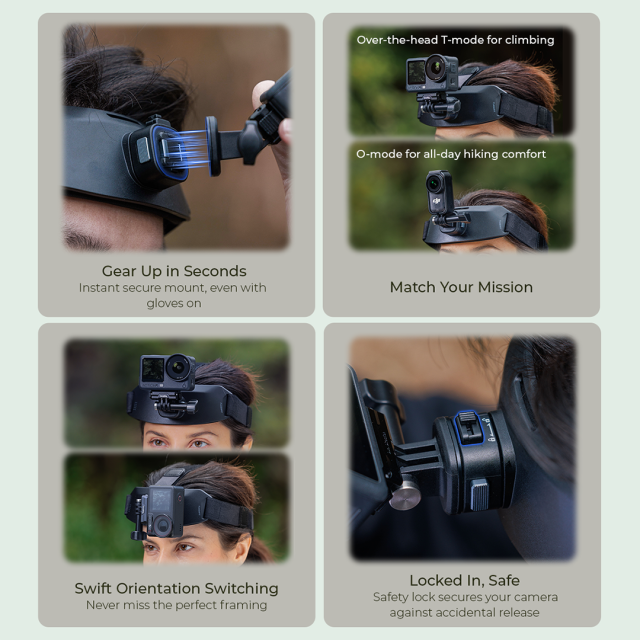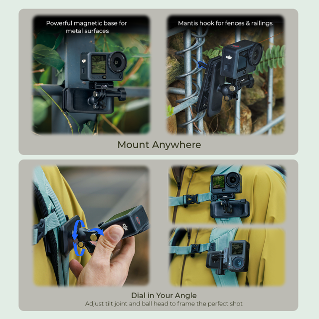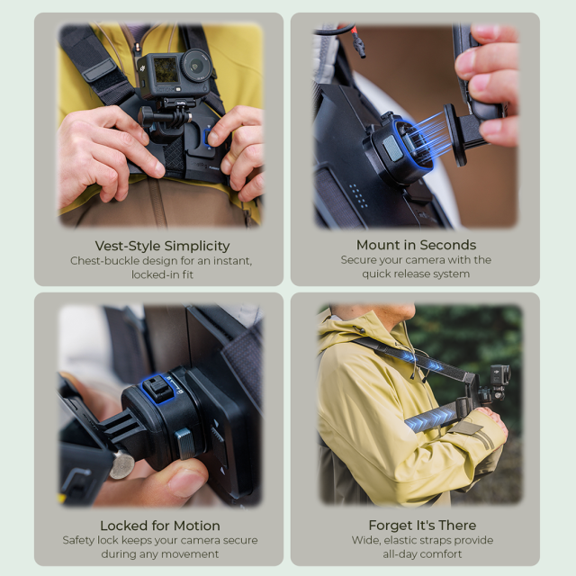 A piacon kapható legtöbb akciókamerával kompatibilis, gyorskioldó interfésszel rendelkezik a kamera azonnali rögzítéséhez és eltávolításához, javítva a felvételek hatékonyságát. A gyorskioldó alap biztonsági retesszel rendelkezik, amely megakadályozza a véletlen kioldást, biztosítva a mozgás közbeni biztonságos tartást.