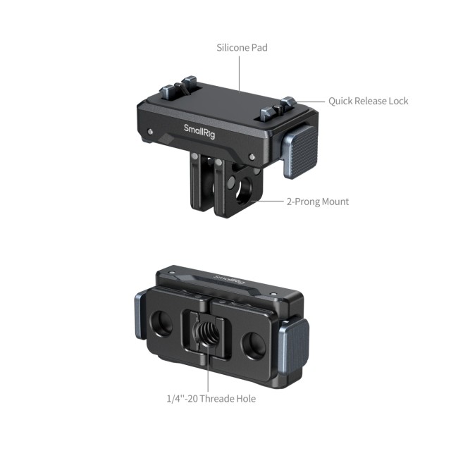 Az alap 2-pólusú rögzítéssel és egy 1/4"-20 menetes rögzítéssel rendelkezik, így kompatibilis a SmallRig különböző kiegészítőivel, beleértve a tapadókorongos rögzítéseket (ID 4235), a rák alakú bilincseket (ID 4102B), a szelfibotokat (ID 5403) és a nyakrögzítéseket (ID 5126).
