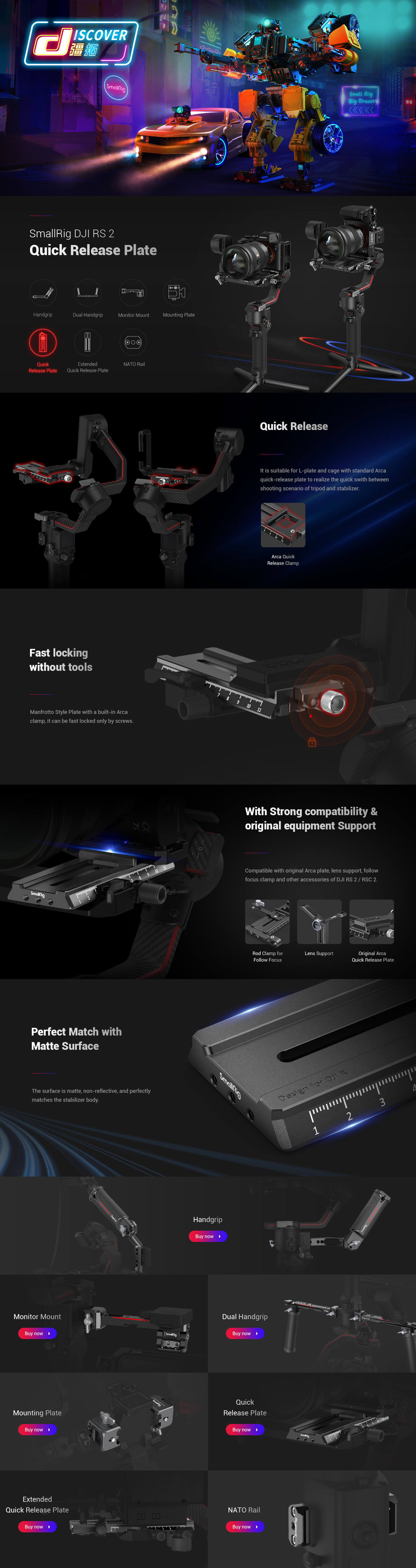 A SmallRig gyorskioldó lemez Arca-Swiss-szel DJI RS 2 / RSC 2 / Ronin-S / RS 3 / RS 3 Pro 3061 a felhasználók számára az Arca-Swiss szabványos L tartó és ketrec közvetlen felszerelését segíti a gimbalra, amely gyorsan válthat az állványok és a gimbal között, ezáltal időt takarít meg a felhasználóknak. A gyorskioldó lemez Manfrotto típusú, beépített Arca-Swiss talppal, és gyorsan, szerszám nélkül, hüvelykujjcsavarral rögzíthető. Állítható leesésgátló kialakítással rendelkezik, amely az eredeti Arca lemezzel párosítva is képes elérni a leesésgátló funkciót. A piacon kapható szabványos Arca-Swiss L konzolhoz és ketrechez is préselhető. A gyorskioldó lemez elfogadja az eredeti kamera lemez kialakítását, és kompatibilis az eredeti Arca-Swiss lemezzel, a DJI RS 2 / RSC 2 / RS 3 / RS 3 Pro / DJI RS 4 / DJI RS 4 PRO, felszerelt fókuszrúd tartóval, és alul egy fogaskerékkel rendelkezik, amely lehetővé teszi a gyorskioldó lemez enyhe beállítását.