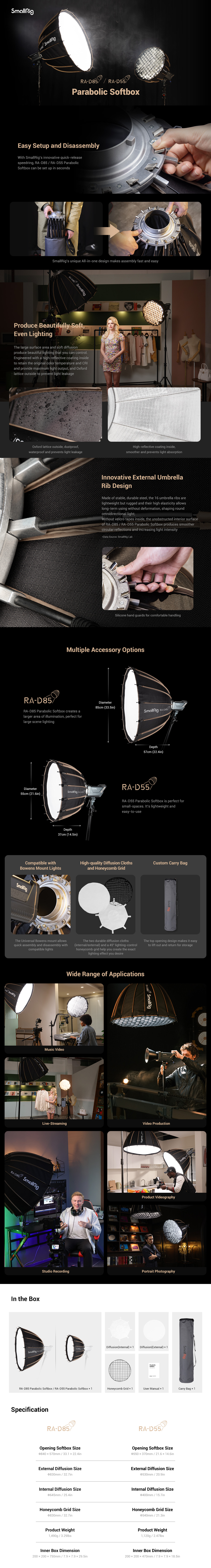 A SmallRig RA-D85 parabolikus softbox 3585 egy sokoldalú, 55 cm átmérőjű lágy fényű kiegészítő. Univerzális Bowens-csatlakozós kialakításának köszönhetően kompatibilis a SmallRig RC 120D/RC 120B/RC 220D/RC220B és más Bowens-csatlakozós lámpákkal. Az új gyorskioldó kialakításnak köszönhetően a kupola könnyen, 15 másodperc alatt felszerelhető és leszerelhető. Az RA-D55 tartalmaz egy kiváló minőségű szövet méhsejtes szűrőt, két diffúziós szűrőt (belső + külső) és egy hordtáskát is.