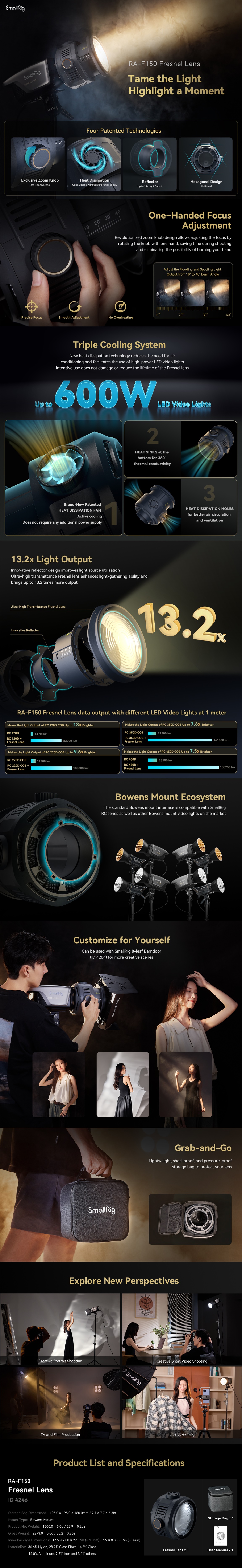 A SmallRig RA-F150 Fresnel lencse 4246 egy profi fókuszáló tartozék. Lehetővé teszi a pontosabb elárasztást és a fény pontosabb ráirányítását bármely tárgyra vagy jelenetre. A 150 mm átmérőjű, nagy fényáteresztő képességű Fresnel-lencse és a beépített reflektor innovatív kialakítása 10-szer nagyobb teljesítményt eredményez. Az innovatív zoom-in/out kialakítás lehetővé teszi a fókusz egy kézzel történő beállítását, így időt takarít meg a felvételkészítés során, és kiküszöböli a kéz túlmelegedésének lehetőségét. A fókuszgomb elforgatásával 10° és 40° közötti sugárzási szöget áraszthat el. A szabványos Bowens-csatlakozó kompatibilis a SmallRig RC120 / 220 / 350 / 450, valamint a piacon kapható más Bowens-csatlakozós lámpákkal. Emellett ez a Fresnel-lencse a SmallRig 8 leveles Barndoors lámpákkal is működhet, hogy még több fényhatást hozzon létre.