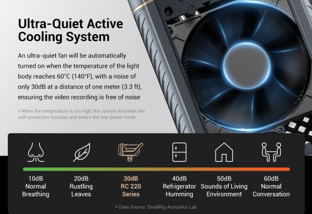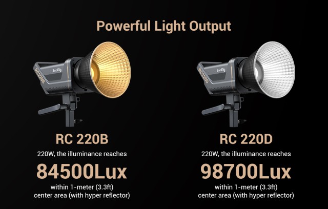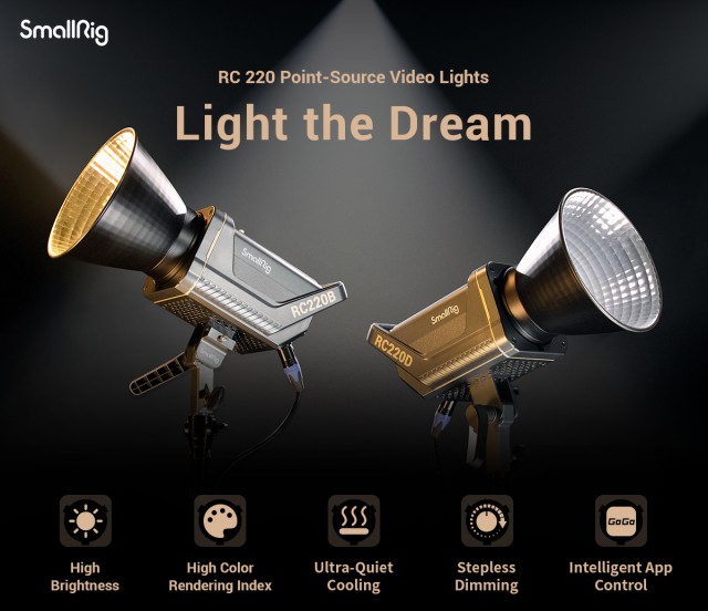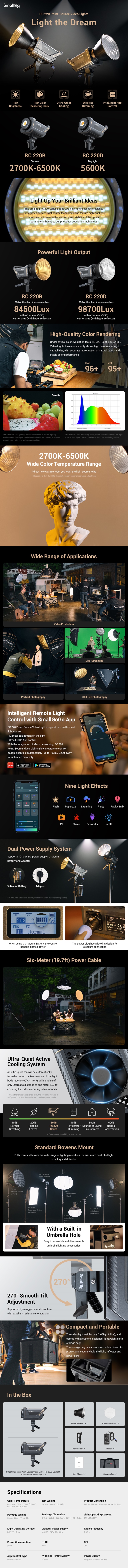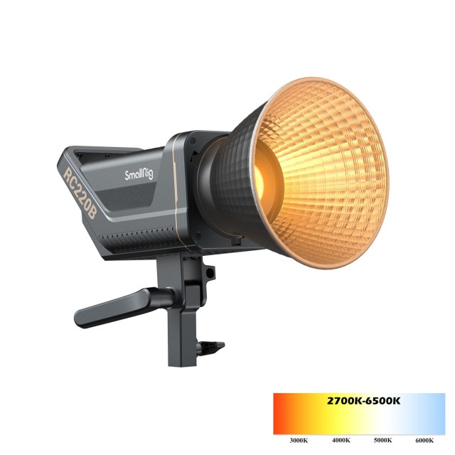 A SmallRig RC220B (3621) a SmallRig első generációs pontforrás LED-es lámpája. A legújabb COB technológiával és a SmallRig ipari formatervezési kiválóságával az RC220B egyedülálló: nagy fényvisszaverő képességű hiperreflektort kínál, 1 méteres távolságban a középső megvilágítás elérheti a 84 500 luxot, ami messze meghaladja a piacon lévő termékek azonos szintjét. A reflektor emellett magas színhűséget (CRI 95+, TLCI 96+), szabványos Bowens rögzítést, 9 beépített fényhatást (Paparazzi, Tűzijáték, Villám, Hibás izzó, TV, Lehelet, Villanás, Party, Láng), a SmallGoGo alkalmazással távolról vezérelhető fényerőt kínál. Az RC220B színhőmérséklet-tartománya 2700K-6500K (+/- 200K) és 84 500 lux megvilágítás (reflektorral).