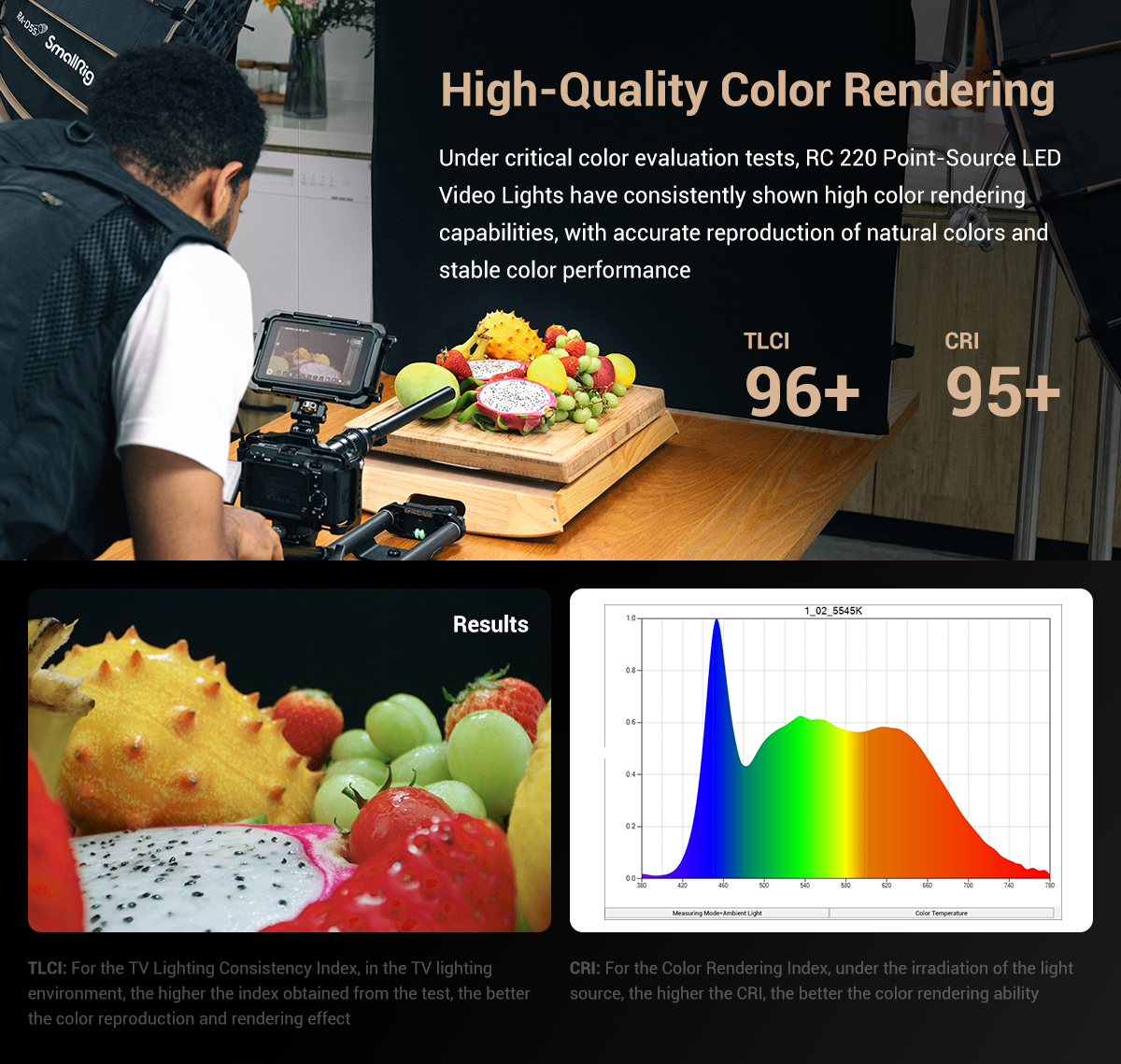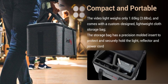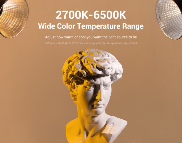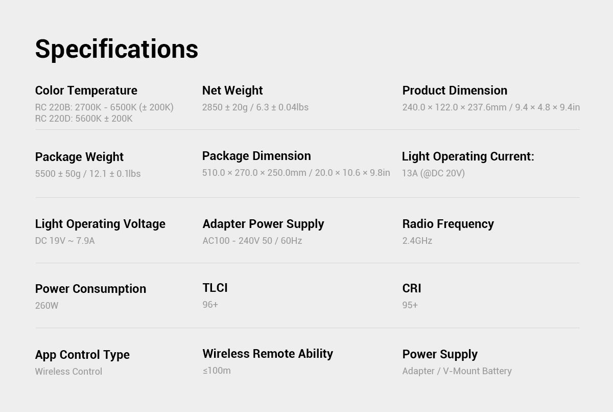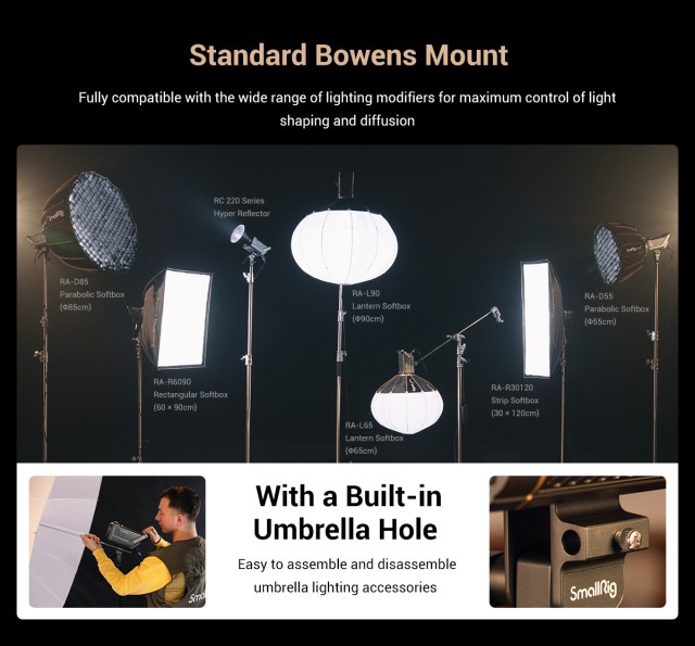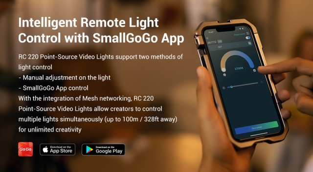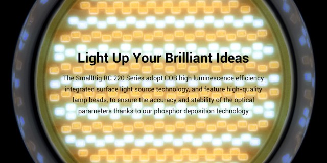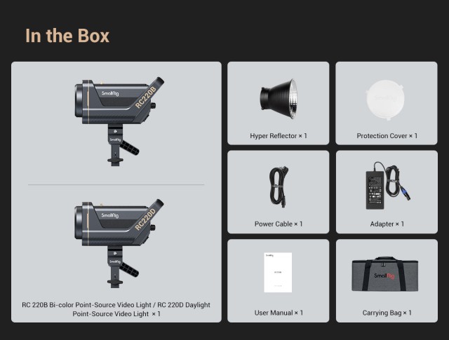 A SmallRig RC220D (3618) a SmallRig első generációs pontforrás LED-es lámpája. A legújabb COB technológiával és a SmallRig ipari formatervezési kiválóságával az RC220D egyedülálló: nagy fényvisszaverő képességű hiperreflektort kínál, 1 méteres távolságban a középső megvilágítás elérheti a 98 700 luxot, ami messze meghaladja a piacon lévő termékek azonos szintjét. A reflektor emellett magas színhűséget (CRI 95+, TLCI 96+), szabványos Bowens rögzítést, 9 beépített fényhatást (Paparazzi, Tűzijáték, Villám, Hibás izzó, TV, Lehelet, Villanás, Party, Láng), a SmallGoGo alkalmazással távolról vezérelhető fényerőt kínál. Az RC220B színhőmérséklete 5600K (+/- 200K) és 98 700 lux megvilágítás (reflektorral).