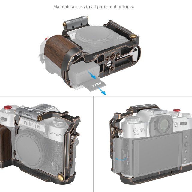 A SmallRig „Retro” Cage for FUJIFILM X-T50 4714 célja a kamera védelme és több bővítő interfész biztosítása a tartalomkészítés megkönnyítése érdekében. A retro stílusú keret 1/4"-20-as csavarral rögzíthető a kamera aljára és egy oldalsó retesszel a bal oldalára, a szilikon párnák pedig megakadályozzák a karcolásokat. A beépített ergonómikus fa markolat biztos fogást biztosít. A keret akadálytalan hozzáférést biztosít a kamera gombjaihoz, kártyanyílásaihoz, LCD-képernyőjéhez, MCS kapcsolójához, akkumulátorához stb. A keret több beépített interfésszel rendelkezik, hogy minden igényét kielégítse: 1/4"-20 menetes furat, ARRI 3/8"-16 rögzítőfurat, hideg cipőfoglalat, hevederfurat stb.
