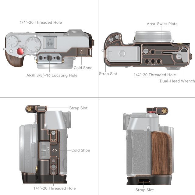 A SmallRig "Retro" Cage for FUJIFILM X100VI 4557 a fényképezőgép védelmére és több bővítő interfész biztosítására szolgál a tartalomkészítés megkönnyítése érdekében. A retro stílusú ketrec alul egy 1/4"-20-as csavarral és bal oldalon egy oldalsó reteszeléssel rögzíthető a fényképezőgéphez, a szilikonbetétek pedig megakadályozzák a karcolásokat. A beépített ergonomikus fa markolat biztos fogást biztosít. A ketrec akadálytalan hozzáférést biztosít a fényképezőgép gombjaihoz, kártyahelyeihez, az LCD-képernyőhöz, az MCS-kapcsolóhoz, az akkumulátorhoz stb. A ketrec több beépített interfésszel rendelkezik, hogy minden igényt kielégítsen: 1/4"-20-as menetes furat, ARRI 3/8"-16-os helymeghatározó furat, hidegcipő rögzítés, szíjfurat stb. Kompatibilis a mikrofonnal (ID: 3487), RGB videólámpával (ID: 4055), csuklópánttal (ID: 3848) stb. is. Emellett az alján található Arca-Swiss gyorskioldó lemez lehetővé teszi a közvetlen felszerelést Arca típusú állványokra. Az alján egy beépített kétfejű csavarkulcs található a könnyű szétszerelés és összeszerelés érdekében. A ketrechez tartozik egy exkluzív forró cipőfedél, amelyre a FUJIFILM hanghullám és az alapítás éve van nyomtatva, a FUJIFILM iránti tiszteletünk jeléül. A puha és kényelmes ujjérintés érdekében egy zárkioldó gombot is tartalmaz.