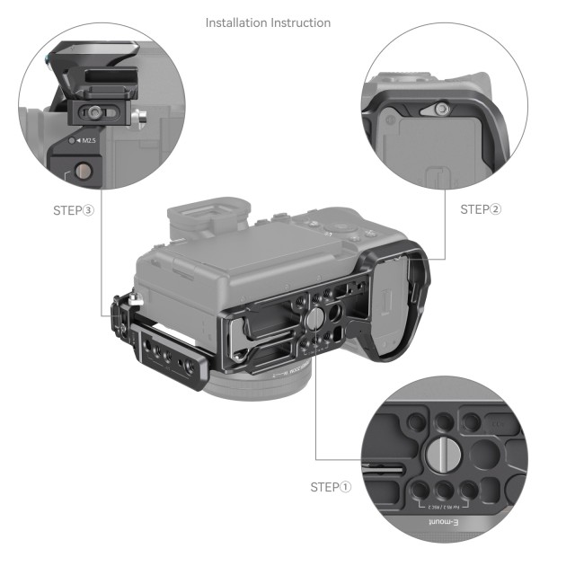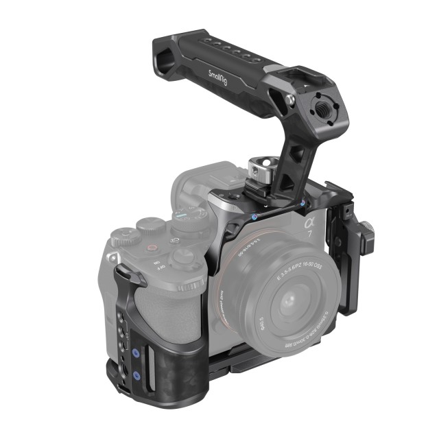 A SmallRig "Rhinoceros" Basic Cage Kit for Sony Alpha 7R V / Alpha 7 IV / Alpha 7S III 3708 úgy lett kialakítva, hogy megkönnyítse az alacsony szögben történő képalkotást, védje a fényképezőgépet, és biztosítsa a tartozékok rögzítési pontjait. A készlet egy cage-et, egy felső markolatot és egy HDMI-kábelrögzítőt tartalmaz. Mind a cage, mind a felső markolat könnyen hordozható, mivel szénszálas anyagból készült, így hosszabb kézből történő felvételkészítésre alkalmas. A cage esetében egy pozícionáló furat, egy 1/4"-20-as csavar és egy M2,5-es csavar együttesen rögzíti a kamerát. Tiszta, áramvonalas kialakítással rendelkezik, amely teljes hozzáférést biztosít a felső gombokhoz.
