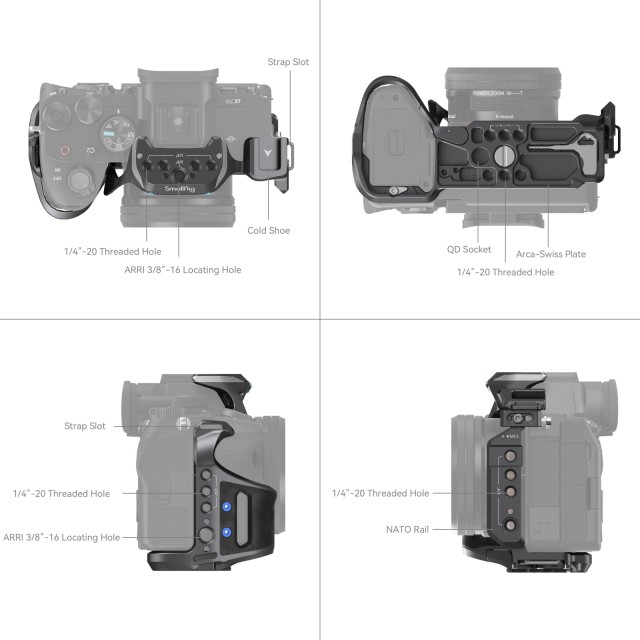 A markolat kényelmes fogást biztosít az alacsony szögből történő felvételkészítéshez; a laposfejű csavarral meghúzott HDMI-kábelrögzítő pedig védi az interfészeket, hogy stabil jelátvitelt biztosítson. Emellett a készlet 1/4"-20-as menetes furatokkal rendelkezik a 2294-es monitorrögzítőhöz, vakusínekkel a mikrofonhoz, LED-videólámpával, valamint ARRI 3/8"-16-os helymeghatározó furatokkal a 2903B monitorrögzítőhöz. Egy NATO-sín és egy Arca-Swiss gyorskioldó lemez teszi sokoldalúvá a cage-et. Különösen az Arca-Swiss lemez teszi lehetővé a gyors váltást a kézi, állványos és kardán (DJI RS 2 / RSC 2 / RS 3 / RS 3 Pro) üzemmódok között.