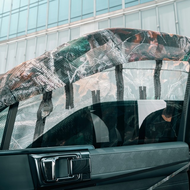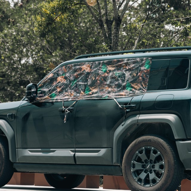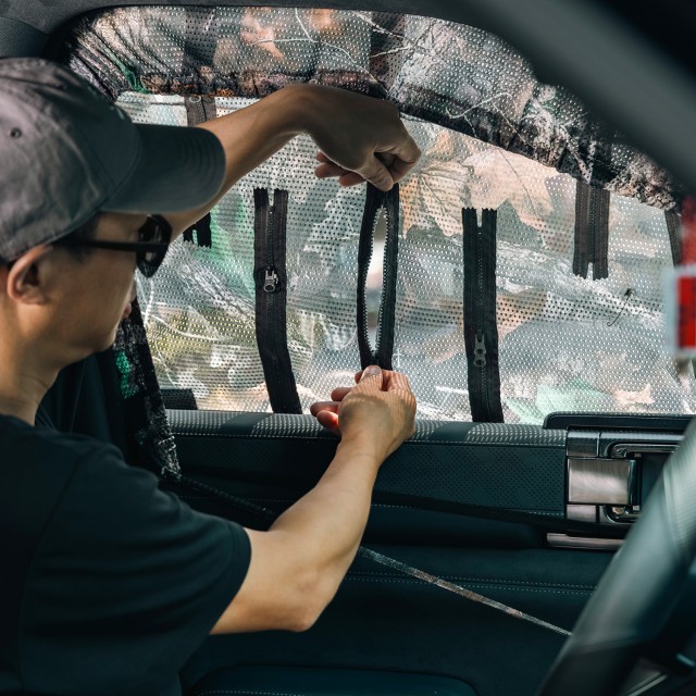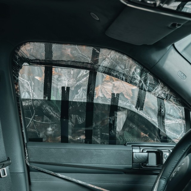 A többirányú cipzárak gyors hozzáférést biztosítanak a megfigyelő ablakokhoz, így a függönyt eltávolítása nélkül is felderítheti a környéket. A kialakítás teljes ablakmozgatást tesz lehetővé, így extrém hő vagy hideg esetén is könnyen beállíthatja a szellőzést. A hátsó tükörre szabott kivágás biztosítja a vezetéshez szükséges kilátást, így a függönyt eltávolítása nélkül is mozgásban maradhat.