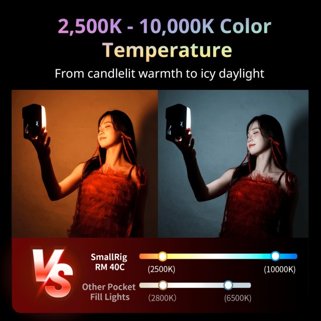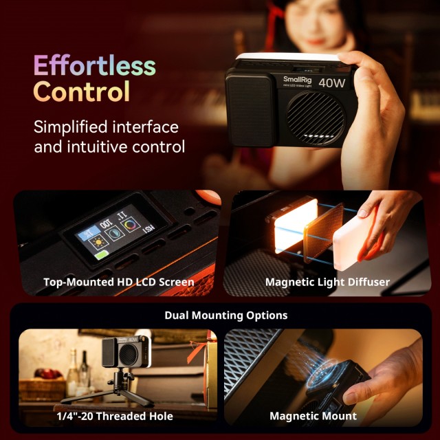 A SmallRig RM 40C egy 40 W-os nagy teljesítményű RGBWW mini LED-lámpa. Kompakt, mégis nagy teljesítményű, 55 perces hosszabb üzemidővel és teljes színű RGB-megvilágítással rendelkezik, amely szélesebb színhőmérséklet- és színskála-vezérlést biztosít. Felhasználóbarát kezeléssel, mágneses rögzítéssel és PD gyorstöltéssel rendelkezik, így tökéletes választás az utazó alkotók számára.