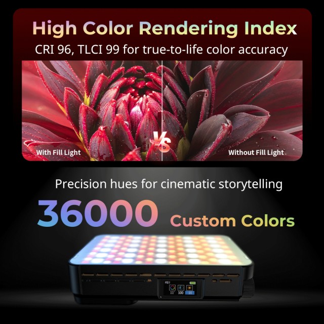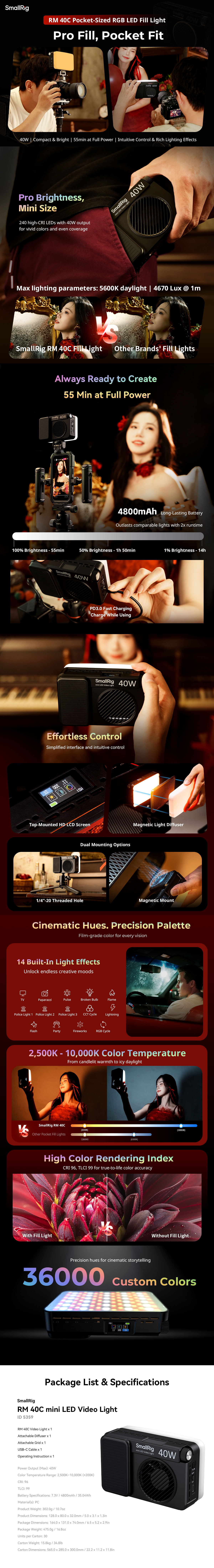 A SmallRig RM 40C egy 40 W-os nagy teljesítményű RGBWW mini LED-lámpa. Kompakt, mégis nagy teljesítményű, 55 perces hosszabb üzemidővel és teljes színskálájú RGB-megvilágítással rendelkezik, amely szélesebb színhőmérséklet- és színskála-vezérlést biztosít. Felhasználóbarát kezelésével, mágneses rögzítésével és PD gyorstöltési funkciójával tökéletes választás az utazó alkotók számára.