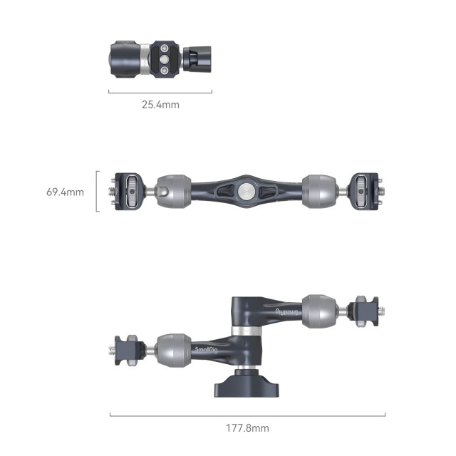 ASmallRig Magic Arm with Rosette Gear (7") 4194 repülőgép-osztályú alumíniumból és rozsdamentes acélból készült, mindkét végén 1/4"-20-as csavarokkal és nyújtható csapokkal rendelkezik az olyan tartozékok biztonságos rögzítéséhez, különösen a csavarodásgátló lyukakkal, mint a monitorok, LED-videólámpák, mikrofonok, mobiltelefonok, iPadek, akciókamerák. A hüvelykujjcsavar segít a tartozékok rögzítésében, és lyukakkal rendelkezik a hatlapos csavarkulcs számára a további meghúzáshoz; a 360 fokban állítható gömbfejek pedig spirális mintázatúak a súrlódás növelése érdekében, és akár 3 kg terhelést is elbírnak. A rozsdamentes acél rozettás csuklónál egy rugó található a könnyebb szögbeállítás érdekében. Az ergonomikusan kialakított, kioldásgátló hüvelykujjkar, beépített tológolyós csapággyal, sima és kényelmes érzést nyújt, és egy másodperc alatt gyorsan rögzíti a kart és a golyósfejeket. Ez a rozetta kar CNC megmunkálással készült a nagyobb robusztusság és tartósság érdekében, és mindkét tartozékrögzítőn párnákkal is fel van szerelve a karcolások elkerülése érdekében.