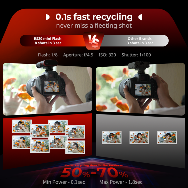 8. A 0,1s és 1,8s közötti gyors újraindítási idő hatékony sorozatfelvételt és tartós vakuteljesítményt tesz lehetővé.
