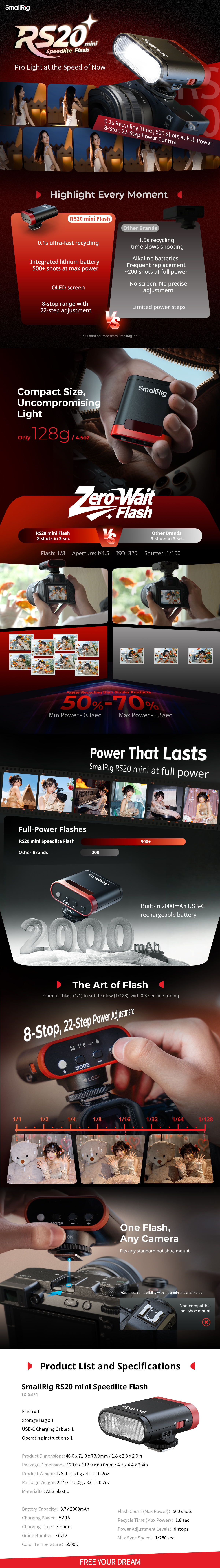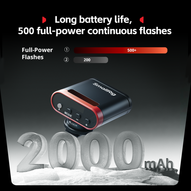 A SmallRig RS20 mini Speedlite Flash egy hordozható, zsebméretű vaku. Tenyérméretű és mindössze 100 g-os könnyű súlya könnyű hordozhatóságot biztosít. Nagy kapacitású, 2000mAh beépített lítium akkumulátorral felszerelt, amely támogatja az USB-C töltést. Akár 500 teljes teljesítményű villanást, és akár 10000 villanást is támogat a leghosszabb kitartás mellett, így biztosítva a hosszabb fotózási munkameneteket.