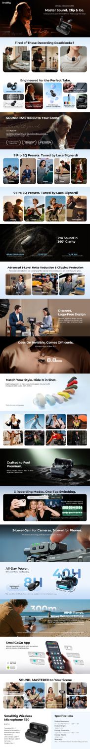 A SmallRig S70-A vezeték nélküli mikrofon (all-in-one) (fekete) 5714 olyan tartalomalkotók és streamerek számára készült, akik több eszközön dolgoznak. Ideális számos helyzetben, például élő közvetítéshez, napi vlogoláshoz, rövid videók készítéséhez, utazási filmekhez és interjúkhoz.