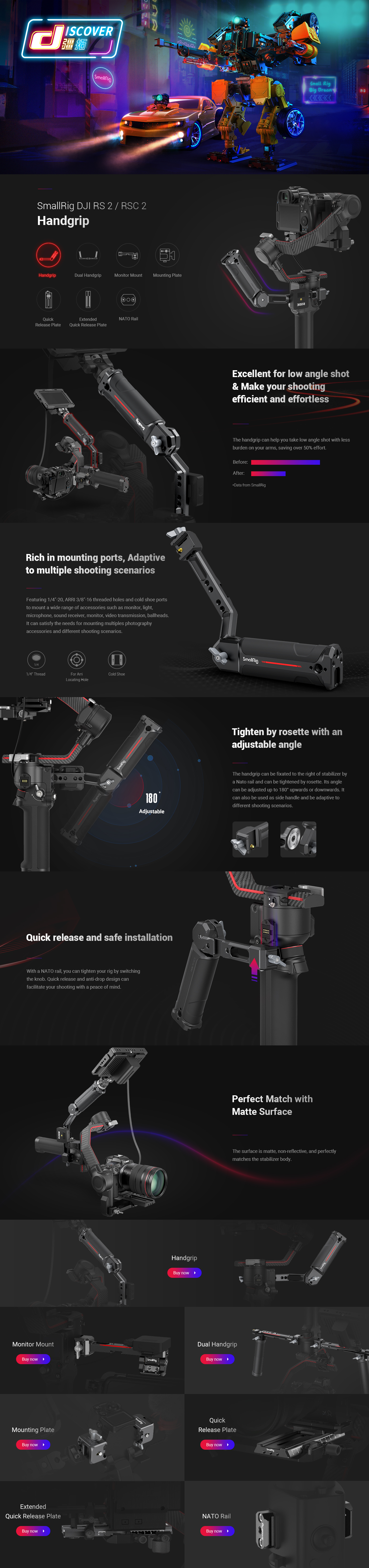 A SmallRig Sling markolat DJI RS 2 / RSC 2 / RS 3 / RS 3 PRO3028 a kar fáradtságának csökkentésére tervezték alacsony szögben történő felvételek során, és bőséges tartozék rögzítési lehetőségeket kínál. NATO-porttal van felszerelve a csatlakozáshoz, és egy eltávolításgátló csappal rendelkezik a biztonságos és gyors működés érdekében. A markolaton több 1/4"-20 és ARRI 3/8"-16 menet van beépítve, ami lehetővé teszi a Magic Arm 2115 és a Monitor Mount 2903 rögzítését. A markolat tetején és oldalán található két cold shoe rögzítővel a markolat vezeték nélküli go, hangvevő és a Monitor Mount 2905 rögzíthető. A markolat szöge egy racsnis gombbal 180°-ig állítható, és oldalsó markolatként is használható a különböző forgatási forgatókönyvek igényeinek megfelelően. A SmallRig vállpánttal KPAC2466 működhet együtt, hogy csökkentse a karok terhelését. A szilikon markolat csúszásgátló kialakítású, és nagyobb kényelmet biztosít a fogás közben. Karcsú kialakítása és kompakt szerkezete tökéletesen illeszkedik a stabilizátorhoz.