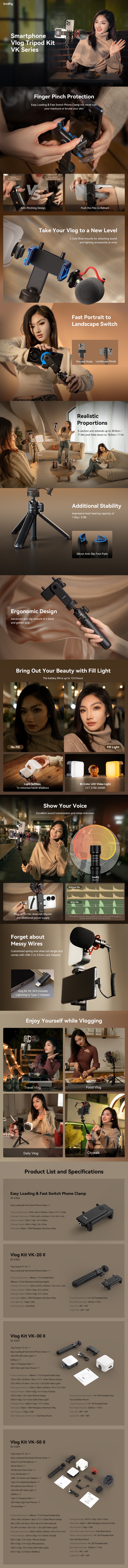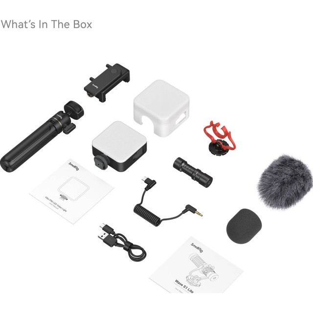 A SmallRig Smartphone Vlog Tripod Kit VK-50 Advanced Version 4369 egy asztali teleszkópos állványból, egy Easy Loading okostelefon tartóból, egy Wave S1 Lite on-camera mikrofonból, egy Vibe P96 LED videólámpából és egy softboxból áll. Ez a kompakt és hordozható készlet lenyűgöző, 1,5 kg / 3,3 font teherbírással rendelkezik. Az állványt egyetlen 1/4"-20-as csavar rögzíti az okostelefon-tartóhoz, amely egyedülálló, könnyen visszahúzható kialakítással rendelkezik az okostelefon gyors fel- és levételéhez. A 360 fokos fogantyúforgatás lehetővé teszi a biztonságos és gyors váltást a portré és a tájképi tájolás között, míg egy pár hidegcipő-csatlakozó lehetővé teszi a kompatibilis tartozékok rögzítését. Emellett a LED-videólámpa három cold shoe rögzítővel rendelkezik, amelyek további tartozékok rögzítését teszik lehetővé. A lámpa 2700-6500K közötti CT-vel és akár 13,5 órás akkumulátoros üzemidővel rendelkezik. Az állvány mindössze 16 cm / 6,3 hüvelyk hosszúságúra hajtható össze. Shotgun mikrofon 3,5 mm-es (0,13 hüvelykes) Type-C kábelre (Type-C Lightning adapterrel is jár) a megállíthatatlan élményért.
