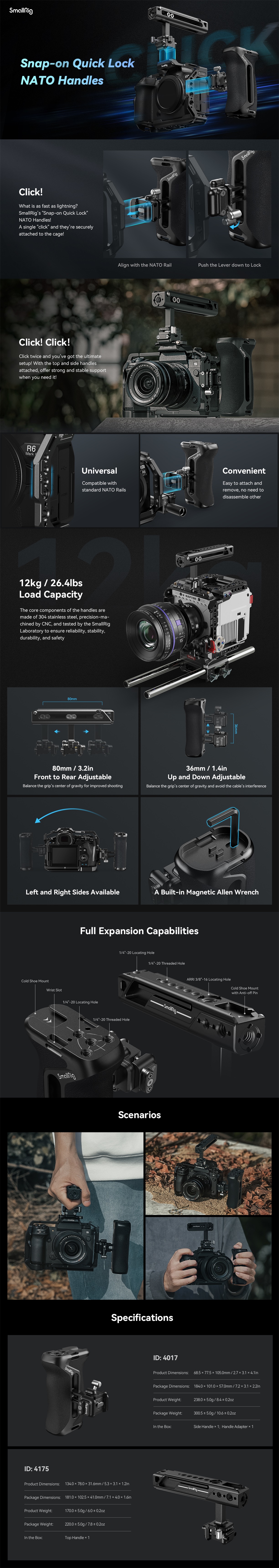 A SmallRig Snap-on Quick Lock NATO oldalsó fogantyút 4017 úgy tervezték, hogy segítse a fényképezőgép mozgását, és stabilizálja a bal- és jobbkezes felvételeket, miközben alapvető tartozékrögzítést biztosít. A szabványos NATO-sínnel kompatibilis fogantyú egy másodpercen belül felpattan, illetve leoldja a NATO-sínt anélkül, hogy előbb más tartozékokat kellene eltávolítani, így időt takarít meg a felvételek készítéséhez. Egy csavarkulccsal tovább feszíthető. A csúszásmentes szilikon kényelmes érzést nyújt, és az ergonomikus kialakításnak köszönhetően bal és jobb kézre egyaránt alkalmas.