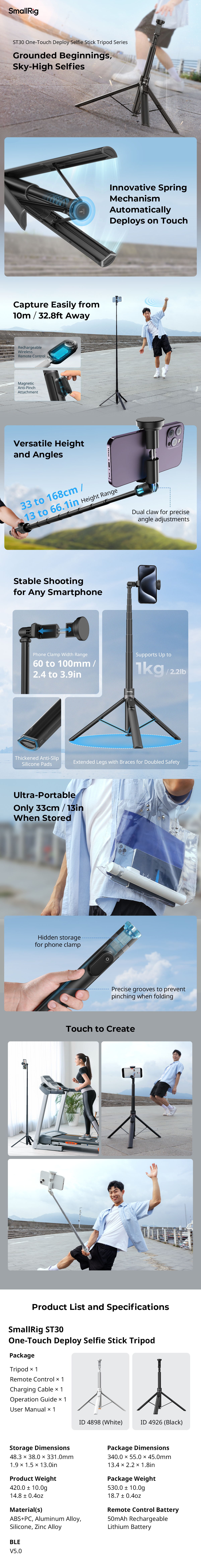 A SmallRig ST30 One-Touch Deploy Selfie Stick Tripod (fehér) 4898 egy sokoldalú társ, amelyet úgy terveztek, hogy zökkenőmentesen alkalmazkodjon a különböző felvételi forgatókönyvekhez. Rugalmas, fokozatmentes hosszbeállítási funkciójával ez az eszköz könnyedén kinyúlik 33 és 170 cm között, így a legkülönfélébb fotózási igényeknek tesz eleget. A kényelem fokozása érdekében a Bluetooth távirányító stabil kapcsolatot tesz lehetővé 10 méteres hatótávolságon belül, és mágnesesen csatlakozik a szelfibothoz.