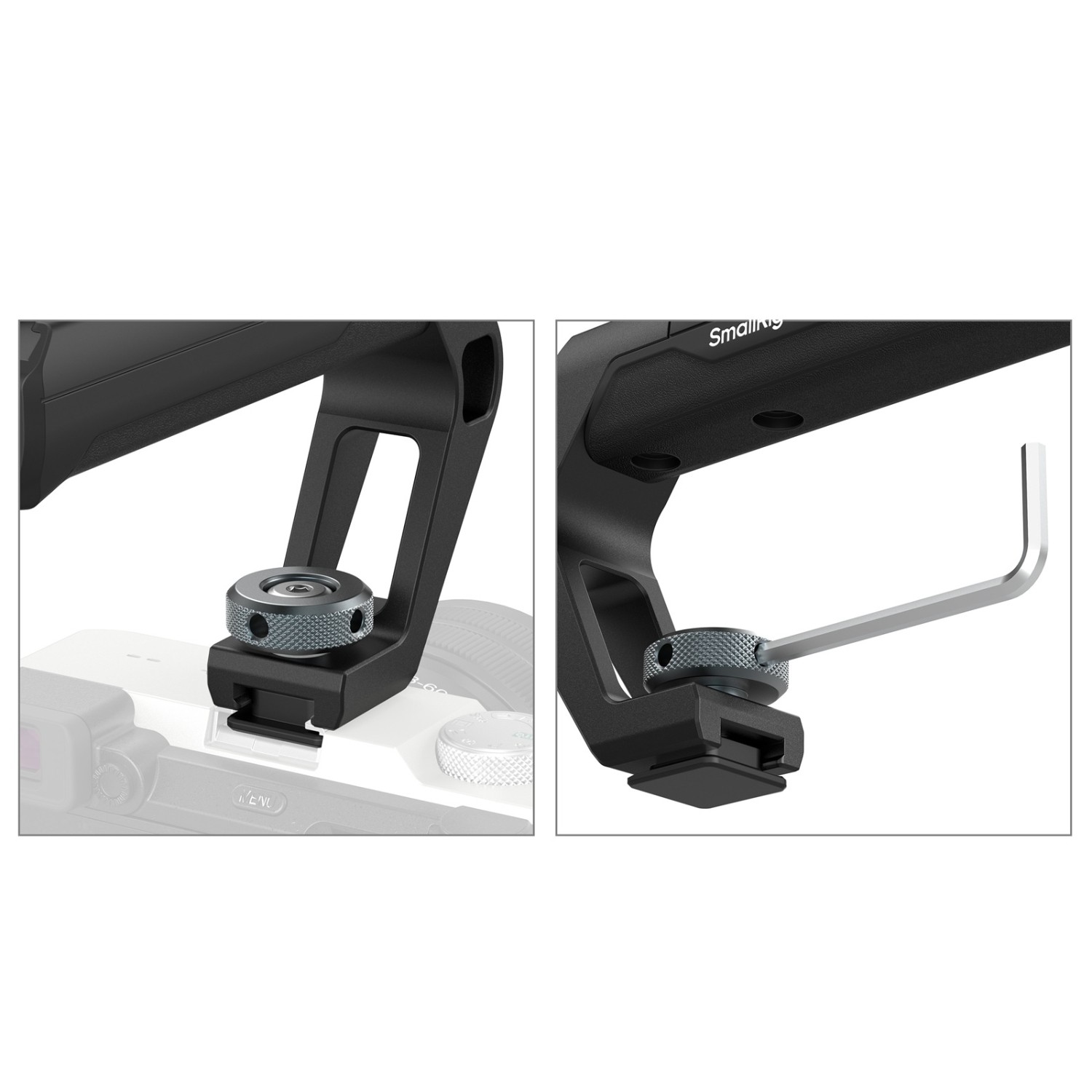 A SmallRig Top Handle with Cold Shoe Mount 5976 egy könnyű fogantyú, amelynek célja a kezelhetőség és a fényképezés mobilitásának javítása. A hideg cipőtalppal közvetlenül a fényképezőgép hot shoe-jához rögzíthető, és a mellékelt imbuszkulccsal rögzíthető. Csak 113 g súlyú, ergonómikus, áramvonalas kialakítású, kivételes kényelmet és irányítást biztosít. A fogantyú meleg, természetes tapintású, így hideg környezetben is kényelmes fogást biztosít.