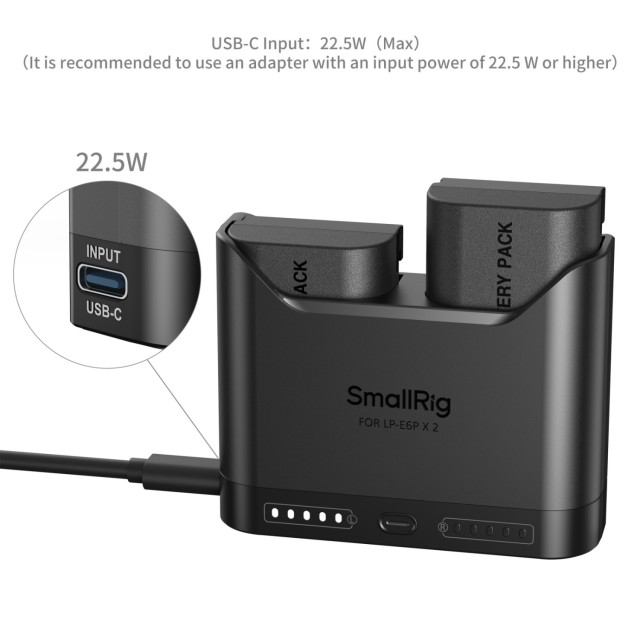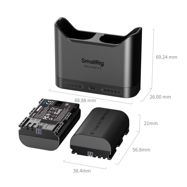 A SmallRig Turbo töltőkészlet LP-E6P kamerákhoz 5485 két nagy teljesítményű akkumulátort és egy kétcsatornás gyors töltőt tartalmaz. Teljes dekódoló chipjével ez a készlet teljes kompatibilitást biztosít a Canon LP-E6P akkumulátorokkal, támogatva olyan kamerákat, mint az EOS R5 II. Megszünteti a felugró figyelmeztetéseket, miközben megőrzi a kamera energia kijelzőjét és a kompatibilitást az eredeti Canon töltőkkel.