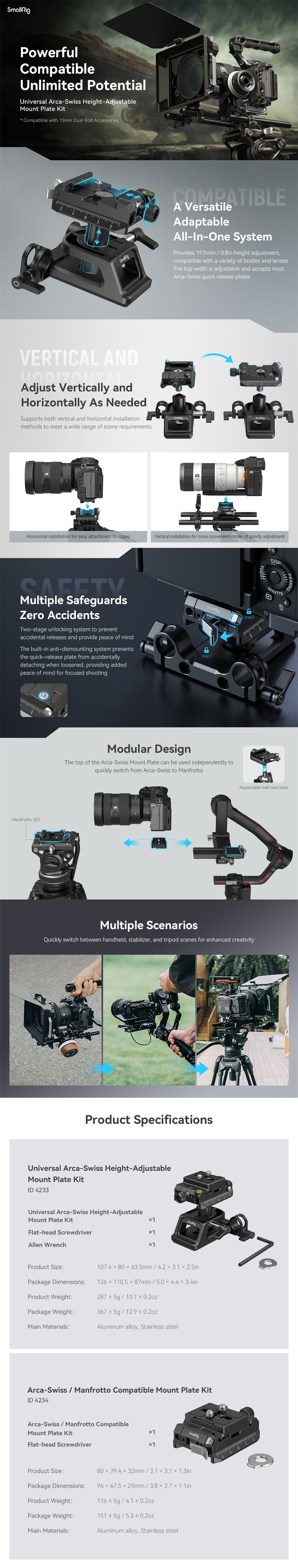 A SmallRig 4233 univerzális Arca-Swiss állítható magasságú rögzítőlemez-készletet úgy tervezték, hogy a 15 mm-es rudak felszerelése után a felhasználók számára megkönnyítse a tartozékok, például a követő fókusz, a matt doboz, a lencsetartó stb. felszerelését. A rögzítőlemez állítható magasságú és kompatibilis a legtöbb tükör nélküli fényképezőgéppel és objektívvel. A felső szélesség gyorsan állítható egy gomb segítségével, így biztosítva a kompatibilitást a piacon kapható legtöbb Arca gyorskioldó lemezzel, kiküszöbölve a kompatibilitási aggályokat. A mellékelt Arca gyorskioldó lemez kompatibilis a DJI RS sorozatú stabilizátorokkal, lehetővé téve a gyors átmenetet a kézi, stabilizátoros és állványos beállítások között.; zárókar kétlépcsős kioldó kialakítással és beépített szétcsúszásgátlóval, amely megakadályozza a véletlen érintkezést, a felszerelés biztonságának védelme érdekében. A rögzítőlemez teteje moduláris kialakítású, így könnyen változtatható a tájolása a ketrecekkel és teleobjektívekkel való kompatibilitás érdekében, a súlypont beállítása érdekében. Szétszerelt állapotban önállóan is használható Arca-Swiss/Manfrotto szerelőlemezként. Beépített 1/4"-20-as menetes furatok és 3/8"-16-os menetes furatok az alján, bővíthető gyorskioldó lemez az állványra való egyszerű rögzítéshez.
