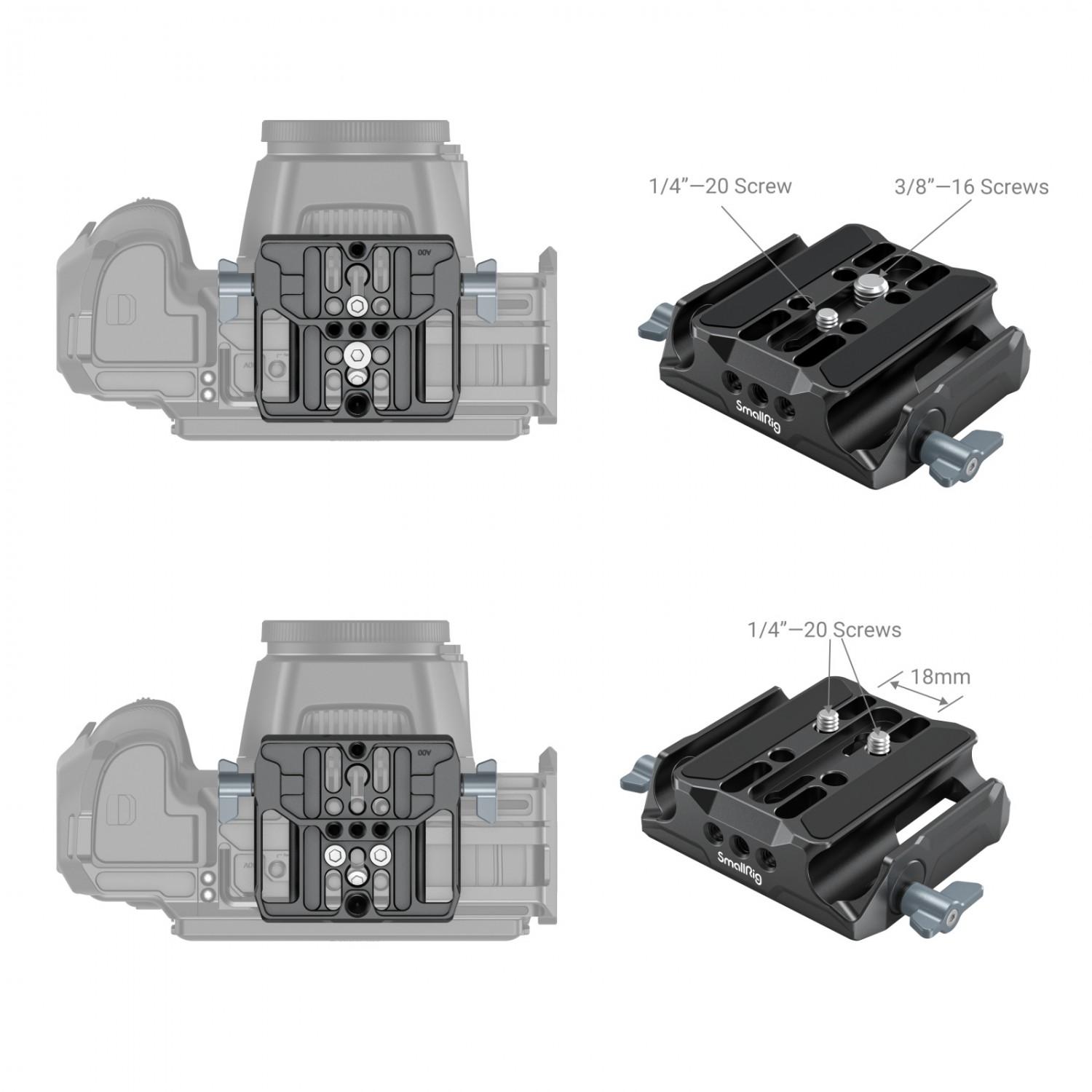 A könnyű és kompakt SmallRig LWS univerzális alaplemez kettős 15 mm-es rúdrögzítővel 3357 alkalmas a piacon kapható általános DSLR és tükör nélküli kamerakosarakhoz. Dupla 15 mm-es rúddal működik, amelyre például kiegészítő objektívtartó, követő fókusz és matt doboz rögzíthető kézből és állványról történő fényképezéskor és felvételkészítéskor. A BMPCC 6K Pro 3270 cage-el együtt használva 85 mm-es optikai magasságot biztosít. Speciálisan kialakított alsó része lehetővé teszi a Samsung T5 SSD cseréjét az alaplap eltávolítása nélkül. A nagyméretű beépített gumipárnák megakadályozzák a karcolódást és az elmozdulást. Az alján található több menetes furat lehetővé teszi különböző méretű gyorskioldó lemezek rögzítését állványhoz.