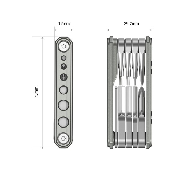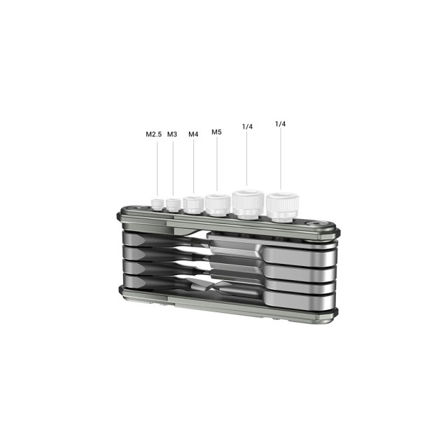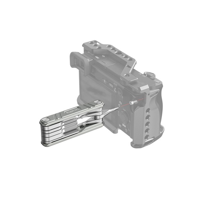 A SmallRig univerzális összecsukható multifunkciós szerszám videósoknak TC2713 a videósok számára hasznos 9 összecsukható szerszámot kombinálja menetes tárolólyukakkal, hogy a csavarok mindig kéznél legyenek. A rozsdamentes acél szerszámokból és alumínium házból készült multifunkciós szerszám egy széles és egy keskeny lapos fejű csavarhúzót, egy PH1 Phillips csavarhúzót és H1.5、H2.0、H2.5、H3.0、H4.0、3/16-os imbuszkulcsokat tartalmaz. A multifunkciós szerszám egyik oldalán található menetes furatok M2,5, M3, M4, M5 és 1/4"-20-as csavarok tárolására biztosítanak helyet.
