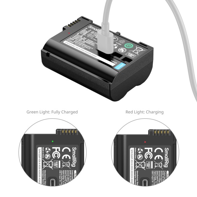 A beépített USB-C töltőport lehetővé teszi a közvetlen töltést power bankokról, fali adapterekről, autós töltőkről vagy elosztókról, így nincs szükség külön töltőre. Az 5 V/2 A bemenetet támogató akkumulátor körülbelül 2,5 óra alatt teljes mértékben feltölthető. A SmallRig EN-EL15c akkumulátor könnyű, tűzálló műanyag burkolatban, tartós kivitelben kapható, és USB-A–USB-C töltőkábelrel és védőfedéllel rendelkezik, így ideális utazáshoz, stúdióban és terepen való használatra.
