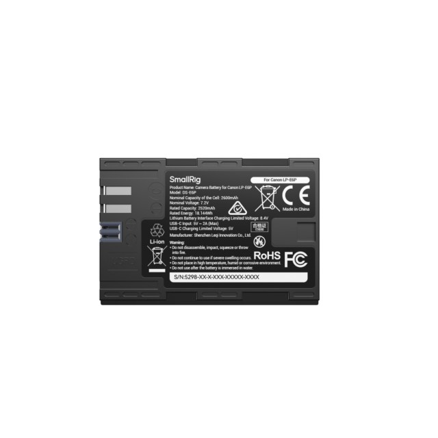 A SmallRig Camera Battery for Canon LP-E6P 5298 5 LED-jelzőfénnyel rendelkezik, amelyek valós időben jelzik az akkumulátor töltöttségi szintjét. A piros figyelmeztető fény jelzi a felhasználóknak, ha az akkumulátor töltöttségi szintje alacsony, így megelőzhető a váratlan kikapcsolás kritikus helyzetekben. A beépített USB-C port támogatja a power bankok, fali adapterek, autós töltők vagy speciális kameratöltők használatát, így bármikor és bárhol kényelmesen feltölthető.