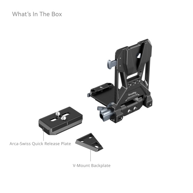 A SmallRig V-Mount akkumulátor tartólemez 4505B egy kompakt, könnyű, kényelmes, all-in-one rögzítési megoldás V-mount akkumulátorokhoz. Az alaplemez kinyújtható, hogy különböző méretű tükör nélküli / DSLR fényképezőgépekhez illeszkedjen. A szerszám nélküli felszerelés és beállítás gyors és időtakarékos. A beépített Arca-típusú rögzítőlemez bármely SmallRig keretet támogat, amely Arca-Swiss lemezzel rendelkezik.