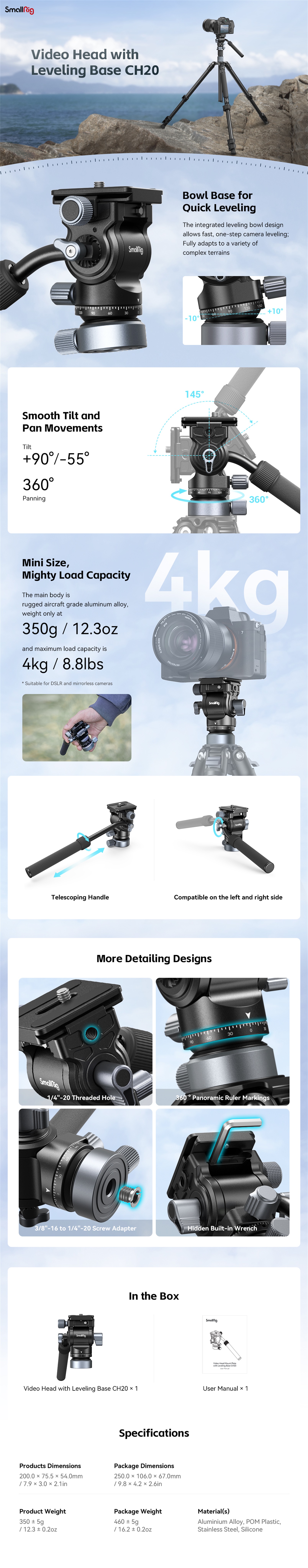A SmallRig videófej rögzítőlemez szintező talppal CH20 4170B egy kompakt és hordozható folyadékfej, amelyet videókészítéshez terveztek. Integrált tálalótalppal rendelkezik, amely lehetővé teszi a 10 / -10 ° -os beállítást a gyors szintezéshez, és mindössze 350 g súlyú, hogy akár 4 kg-ot is elbírjon. A levehető teleszkópos fogantyúnak köszönhetően könnyen tárolható és hordozható; az 1/4"-20-as menetes furat olyan tartozékokat támogat, mint a varázskar. A fej emellett 360°-ban forgatható és 90° / -55°-ban dönthető, így különböző szögekből is stabilan fényképezhet. Emellett a beépített imbuszkulcs segít a fényképezőgép felszerelésében vagy eltávolításában.