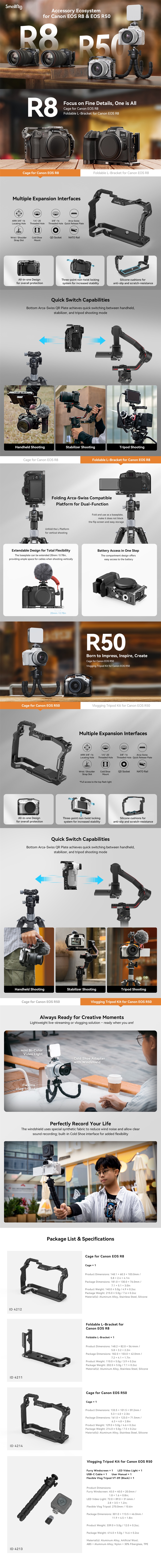 A SmallRig Vlogging Tripod Kit for Canon EOS R50 4213, úgy tervezték, hogy könnyű, mégis hordozható Vlog felvételi megoldást nyújtson a tartalomkészítők számára. Tökéletes a kiváló minőségű felvételek, a szuper stabil kézi felvételek és az utómunkához szükséges egyszerű színbeállítás eléréséhez, tartalmaz egy szőrös szélvédőt, egy rugalmas állványt és egy LED-videólámpát. Közülük a szőrös szélvédő dedikált poliészter gyapjúval és megvastagított bélés kialakítással rendelkezik, hogy csökkentse a szélzajt a szabadban történő felvételeknél. Biztonságosan rögzíthető a forrócipőre egy hidegcipő-adapteren keresztül, amely alul védő szilikonbetétekkel és egy hidegcipő-csatlakozóval rendelkezik a LED-videólámpa, mikrofon stb. számára.
