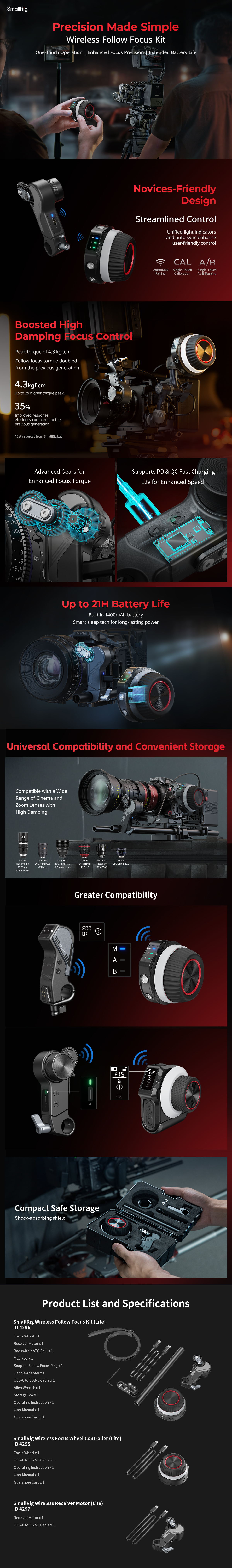 A SmallRig Wireless Follow Focus Kit (Lite) 4296-ot úgy tervezték, hogy pontos és alacsony késleltetésű fókuszálást biztosítson a videókészítéshez. A készlet piros és kék fényjelzőkkel rendelkezik a csatlakozási állapot és a csatornák jelzésére (kék fény - F00-1; zöld fény - F15-1), intuitív és felhasználóbarát kezelési útmutatót kínál az egyszerű és hatékony vezérléshez. A készlet memóriatároló funkcióval rendelkezik, így áramkimaradás esetén nem kell újra kalibrálni az objektív út- és AB pont beállításait, ami növeli a felvételek hatékonyságát. A beépített 1400mAh kapacitású akkumulátorral felszerelt készülék körülbelül 21 órányi hosszabb használatot biztosít. Az izzadásálló, csúszásmentes szilikon anyagból készült fókuszkerék kényelmes és stabil csillapítású fókuszálást biztosít különböző hőmérsékleti körülmények között. A vevőmotor széles, 5V-18V-os bemeneti feszültségtartományt támogat, kompatibilis a PD és QC gyorstöltési protokollokkal. A precíziós fogaskerék-összeállítású kialakítást használva 4,3 kgf-cm csúcsnyomatékot biztosít a zoomobjektívek könnyed vezérléséhez.