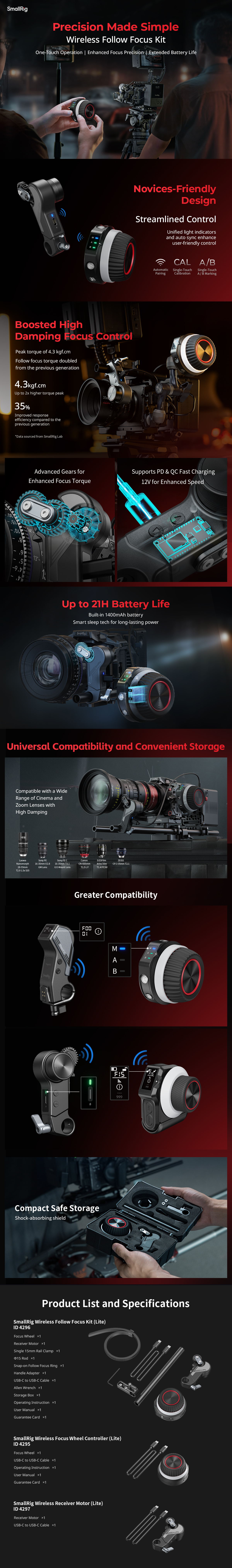A SmallRig Wireless Follow Focus Kit (Lite) 4296B úgy lett kialakítva, hogy pontos és alacsony késleltetésű fókuszálást biztosítson a videókészítéshez. A készlet piros és kék fényjelzőkkel rendelkezik a kapcsolat állapotának és a csatornáknak a jelzésére (kék fény - F00-1; zöld fény - F15-1), intuitív és felhasználóbarát kezelési útmutatást kínálva az egyszerű és hatékony vezérléshez. A készlet memóriatároló funkcióval rendelkezik, így áramkimaradás esetén nem kell újra kalibrálni az objektív út- és AB pont beállításait, ami növeli a felvételek hatékonyságát. A beépített 1400mAh kapacitású akkumulátorral felszerelt készülék körülbelül 21 órányi hosszabb használatot biztosít.