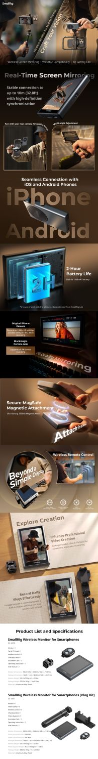 A SmallRig Wireless Video Monitor for Phone 4850B képernyő tükrözési megoldást kínál mobil tartalomkészítéshez. A termék tartalmaz egy mobiltelefon-monitort, egy forgatható és dönthető fejet, egy vezeték nélküli távirányítót, egy töltő kábelt és egyéb kiegészítőket. A monitor a forgatható és dönthető fej segítségével a telefonkeretre szerelhető, vagy mágnesesen rögzíthető iPhone-okhoz vagy mágneses gyűrűvel ellátott telefonokhoz, így sokoldalúan használható. Alacsony szögű mobilfotózás vagy hátsó kamerával történő felvételkészítés során a monitor valós időben tükrözi a mobil kamera képét.