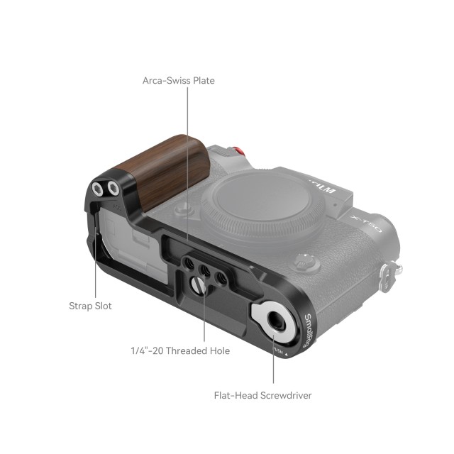 A SmallRig fa L-alakú markolat FUJIFILM X-T50 (fekete) 4784 a fényképezőgép fogásának javítására készült. Az L-alakú markolat egy 1/4"-20-as csavarral rögzíthető a fényképezőgéphez az alján, a beépített szilikonbetétek pedig megakadályozzák a karcolásokat. A markolat természetes tömör fából készült, elegáns, gazdag, természetes tapintású, és ergonómiailag úgy tervezték, hogy javítsa a fogásérzetet. A beépített Arca-Swiss gyorskioldó alaplemez lehetővé teszi az egyszerű és gyors Arca-típusú állvány összeszerelését és szétszerelését. Négy 1/4"-20-as menetes furat az alján a Manfrotto-típusú lemezek és állványok rögzítéséhez. Pánthely a csuklópánthoz (azonosító: 3848). Beépített lapos kulcs az alján a tartozékok egyszerű összeszereléséhez és szétszereléséhez. A markolat a FUJIFILM iránti tiszteletünk jeléül a "FUJIFILM" hanghullámmal és az alapítás évével lenyomott exkluzív forró cipőfedéllel érkezik. A puha és kényelmes ujjérintés érdekében egy zárkioldó gombot is tartalmaz.