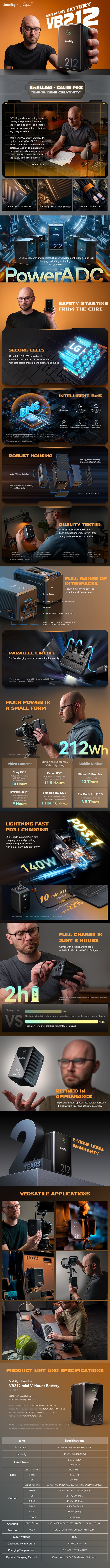 A SmallRig x Caleb Pike VB212 mini V Mount Battery 4293 nagymértékben integrált kialakítást alkalmaz, ami csökkenti az akkumulátor méretét, könnyebbé és hordozhatóbbá teszi. Az akkumulátor egyesíti a gyorstöltési protokoll chipeket, az MCU-t, a feszültségszabályozást és a BMS chipeket. Támogatja a gyorstöltési protokollok széles skáláját (PD 3.1 / QC 3.0 / AFC stb.), kétirányú PD gyorstöltés és kisütés 140W (Max), valamint adaptív feszültség / áramszabályozás stb. Ezenkívül a testreszabott intelligens BMS rendszere gyorsabb és biztonságosabb töltést biztosít a túláram / rövidzárlat / túlhőmérséklet / túlfeszültség védelemmel stb. Az akkumulátortest D-Tap / USB-C / USB-A / DC 8V-OUT / DC12V-OUT / BP interfészekkel van felszerelve, amelyekkel a kamera / videokamera / monitor / vezeték nélküli képátvivő / LED-videólámpa / mobiltelefon / laptop stb. tölthető vagy táplálható, V-mount lemezek használata nélkül. A BMS chip beépített 16 bites Smart ADC-vel rendelkezik, amely az MCU-val és egy TFT kijelzővel kombinálva lehetővé teszi, hogy bármikor és bárhol nyomon követhesse az akkumulátor állapotát. A beépített prémium akkumulátorcellák (nem felfújt kapacitásúak) ciklikusan tölthetők és kisüthetők, ami kiváló teljesítményt és stabilitást biztosít. A kialakítás megfelel a nemzetközileg elismert szabványoknak, mint például az MSDS / UN38.3 / IEC62133 / UL2054 / UL62368, így biztonságosabb a használata. A szilikon bevonattal ellátott alumíniumötvözetből készült test robusztusságot biztosít és cseppállóvá teszi. A TPU és a PC V0 anyagok hőállóvá és tűzállóvá teszik az akkumulátort. A karcálló PC és az akril borítás növeli a tartósságot és védi a TFT kijelzőt, amely világosan és pontosan mutatja az akkumulátor állapotát. A pontosan megtervezett fedél és a jól elhelyezett hornyok lehetővé teszik a gyors és könnyű kölcsönhatást a porvédővel. Összességében ez az elem biztonságos és elég erős ahhoz, hogy minden csodálatos pillanatot gond nélkül megörökíthessen.