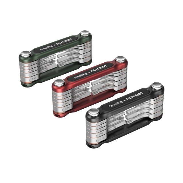 A SmallRig x FILM RIOT 10 az 1-ben összecsukható kulcskészlet többszöges pozícionálással (fekete) 4375 kifejezetten a fotó- és videósok számára készült. A 10 az 1-ben készlet összecsukható kialakítással rendelkezik, amely biztosítja a hordozhatóságot és a kényelmet, és lefedi a fotó- és videóiparban elterjedt kulcsméreteket. Az exkluzív szabadalmaztatott szerkezeti kialakításnak köszönhetően minden egyes kulcs biztonságosan 90°-ban vagy 180°-ban pozícionálható, megkönnyítve a tartozékok hatékony összeszerelését és szétszerelését a felvételek előtt és után. A készlet csúszásmentes szilikonbevonattal rendelkezik a kényelmes fogás érdekében. Az alumíniumötvözetből és rozsdamentes acélból készült kulcskészlet garantálja a tartósságot és a megbízhatóságot.