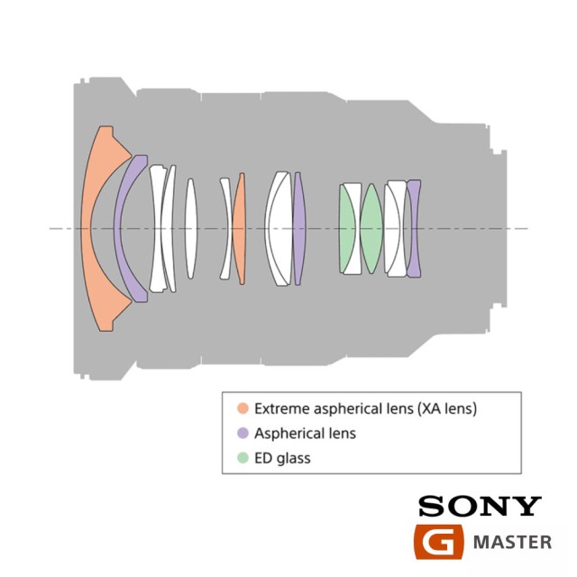 Ez az objektív két Sony XA (extrém aszférikus) elemmel rendelkezik 0,01 mikronos felületi pontossággal. A nagylátószögű zoomobjektíveknél hajlamos torzítás, valamint az asztigmatizmus és a mezőgörbület aprólékosan szabályozott. A nem vonzó hagymagyűrűs bokeh-t az XA (extrém aszférikus) elemek hatékonyan elnyomják, így a fókuszon kívüli területeken sima, szép bokeh érhető el.