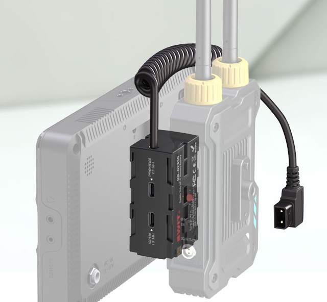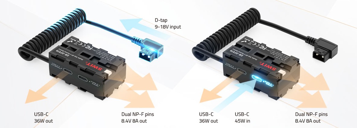 A DB-DF570 dummy akkumulátor támogatja a D-tap 9-18 V-os tápellátást vagy az USB-C PD 45 W-os bemenetet, és kettős NP-F csapokra konvertálja a szabályozott 8,4 V 8 A kimenetet és az USB-C PD 36 W kimenetet.