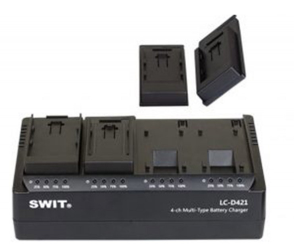 A SWIT LC-D421V KIT egy professzionális, 4 csatornás DV akkumulátortöltő, amelyhez 4 db JVC BN-VF típusú lemez tartozik. Csatornánként 2 A kimeneti teljesítményével és LED töltésjelzőivel akár négy DV akkumulátort is képes egyszerre tölteni, körülbelül egy óra alatt.