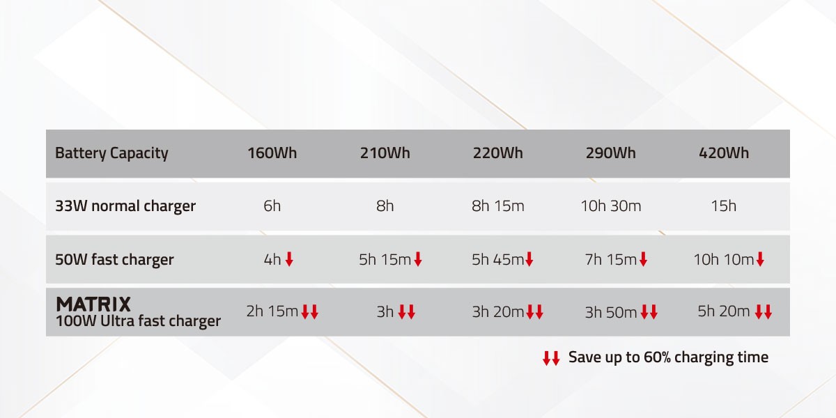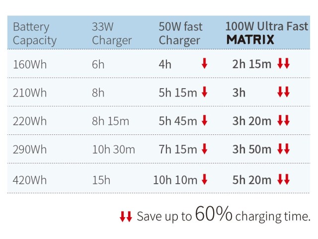 A töltő maximális teljes kimeneti teljesítménye 900 W, amely nyolc független töltőcsatornára oszlik. A 160 Wh vagy annál nagyobb kapacitású SWIT 14,4 V-os akkumulátorok esetében minden csatorna 16,8 V egyenáramot biztosít 6 A maximális áramerősséggel, ami csatornánként 100 W kimeneti teljesítményt eredményez. Hasonló kapacitású SWIT 28,8 V-os akkumulátorok esetén minden csatorna 33,6 V egyenáramot biztosít 3 A maximális áramerősség mellett, ami szintén csatornánként 100 W teljesítményt eredményez. A harmadik féltől származó akkumulátorok 16,8 V egyenáramot kapnak 3 A maximális áramerősség mellett, ami csatornánként 50 W teljesítményt eredményez. A töltő 100 V és 240 V közötti váltakozó áramú bemeneti teljesítményt fogad el 50/60 Hz frekvencián, ami globális kompatibilitást biztosít a különböző elektromos szabványok között.