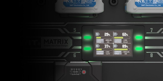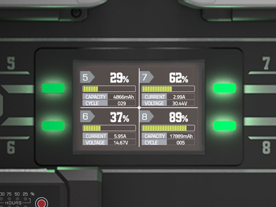 A MATRIX-S8 kettős 3,5 hüvelykes színes LCD kijelzővel rendelkezik, amely valós időben figyeli az egyes töltési csatornákat. Ezek a kijelzők a töltés előrehaladását, a töltési áramot, a kimeneti feszültséget és az akkumulátor ciklusszámát mutatják, biztosítva a rendszer folyamatos átláthatóságát. A nagy LED töltésjelzők kiegészítik az LCD kijelzőket, lehetővé téve a kezelők számára, hogy távolról, anélkül, hogy közvetlenül a készülékhez kellene közeledniük, gyorsan felmérjék a töltés állapotát, megkönnyítve ezzel a hatékony irányítást a forgalmas gyártási létesítményekben.