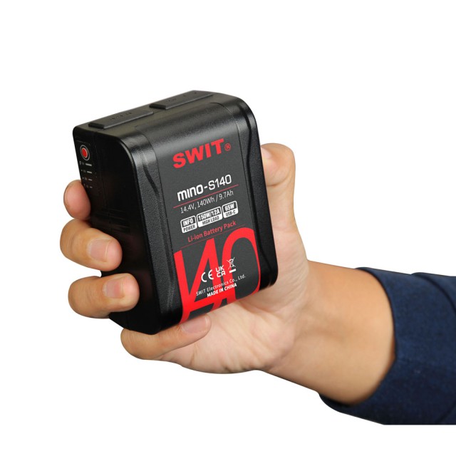 Az új MINO-S140 a népszerű SWIT 98Wh-s Pocket V-mount akkumulátorral összehasonlítva 43%-kal nagyobb kapacitást biztosít, de még mindig apró méretű, így kényelmesen hordozható.