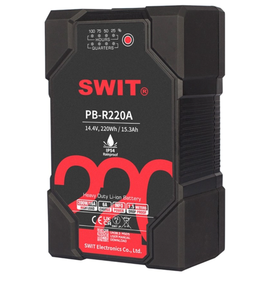 A SWIT PB-R220A egy 220 Wh-s, nagy teljesítményű Gold-Mount akkumulátor, amelyet professzionális kamerák megbízható tápellátására terveztek. Robusztus felépítésének, nagy terhelhetőségének és gyors töltési képességének köszönhetően hosszú élettartamot biztosít a igényes kültéri és stúdiófelvételekhez.