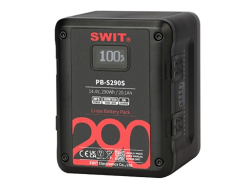 A SWIT PB-S290S 290Wh többcsatlakozós négyzet alakú Cine akkumulátor professzionális film- és televíziós alkalmazásokhoz lett kifejlesztve, amelyek hosszabb üzemidőt és nagy terhelésű teljesítményt igényelnek. 14,4 V névleges feszültséggel és nagy, 290 Wh (20,1 Ah) kapacitással a PB-S290S körülbelül 10 órán át képes táplálni a szabványos ENG kamerákat, és körülbelül 3,5 órán át az ARRI ALEXA kamerákat.