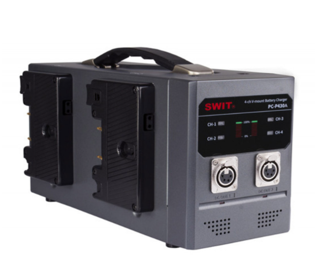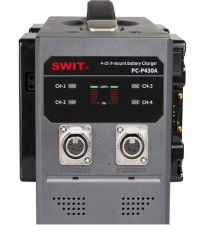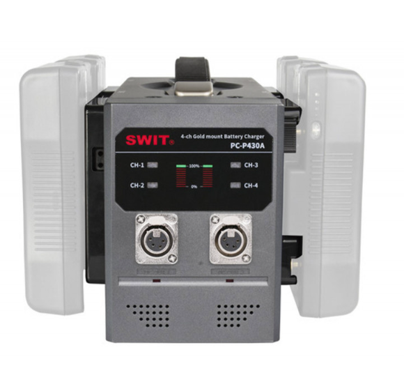 A SWIT PC-P430A egy professzionális, 4 rekeszes Gold Mount gyors töltő, amely akár négy lítium-ion akkumulátort is képes egyszerre tölteni, csatornánként 16,8 V/3 A teljesítménnyel. Kettős 4-tűs XLR DC kimenettel (6 A/90 W), univerzális 100–240 V AC bemenettel és intelligens védelmi áramkörrel rendelkezik, emellett megbízható AC-DC tápegységként is működik broadcast és stúdióberendezésekhez.
