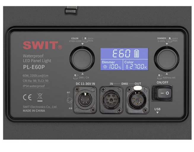 A SWIT PL-E60P 3. generációs Natural-Born-Soft LED panel lámpa fejlett optikai technológiát és professzionális teljesítményt ötvöz ultra-vékony és vízálló kialakításban. 60 W-os, lágy, egyenletesen elosztott fényt biztosít egy 14" × 14" méretű panel területén, 1 méter távolságban 1500 lux fényerőt (139,3 fc) biztosít, széles, 70°-os sugárzási szöggel, így ideális broadcast stúdiókhoz, zöld háttérrel történő produkciókhoz, interjúkhoz és élő közvetítésekhez.