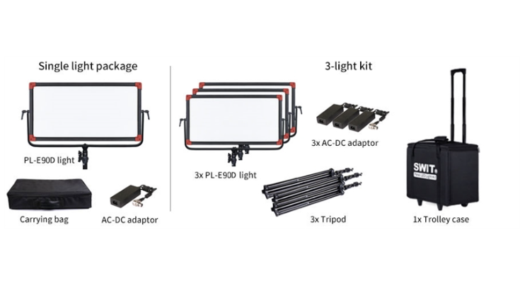 A SWIT PL-E90D 3KIT egy professzionális, hordozható világítási megoldás, amelyet televíziós műsorok, dokumentumfilmek, interjúk és stúdióalkalmazásokhoz terveztek. Minden PL-E90D LED-panel 480, szélén elhelyezett SMD LED-et használ, amelyeket a SWIT egyedülálló 90°-os fényvezető technológiájával kombináltak, így rendkívül lágy, fényes és egyenletesen elosztott fényt biztosítanak, miközben vékony és könnyű formátumot tartanak fenn.